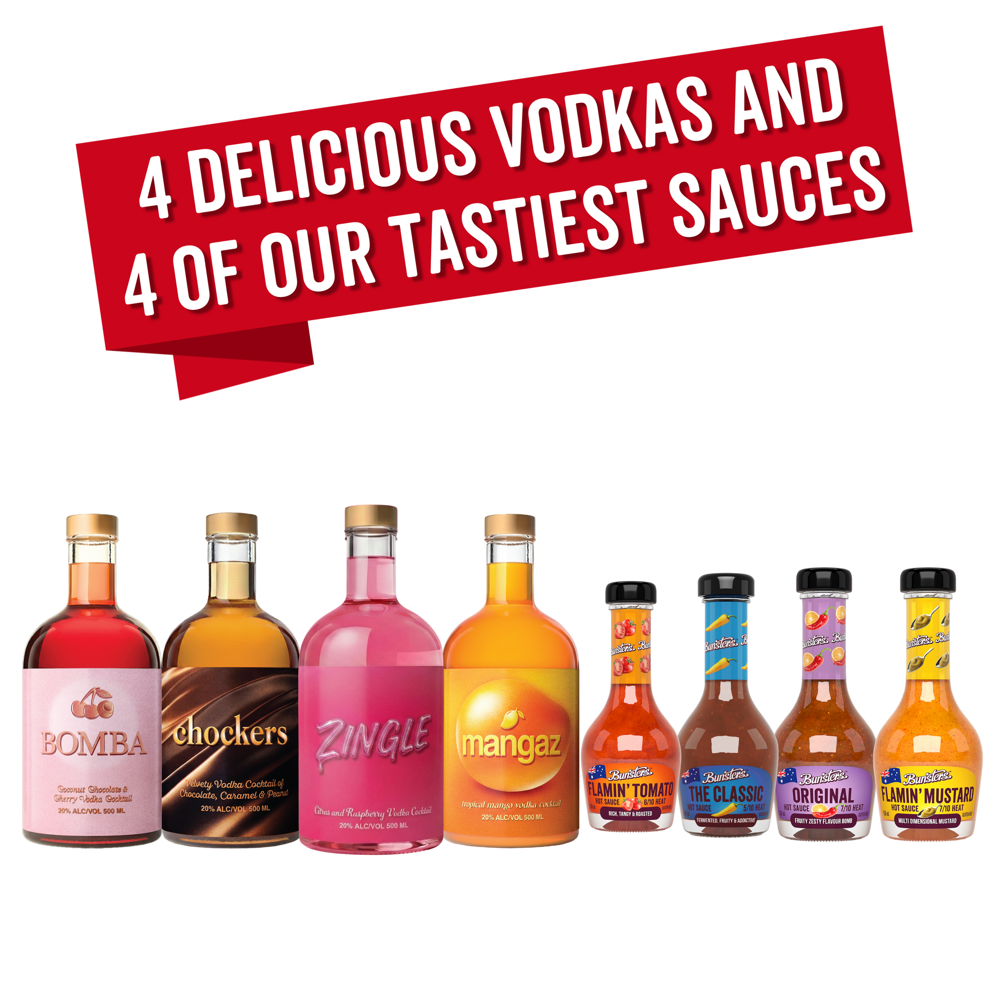Four of Bunsters best selling Vodkas and four of our Most Flavourful hot sauces all in one handy pack. The ideal gift for anyone who enjoys eating and drinking. Know anyone like that?