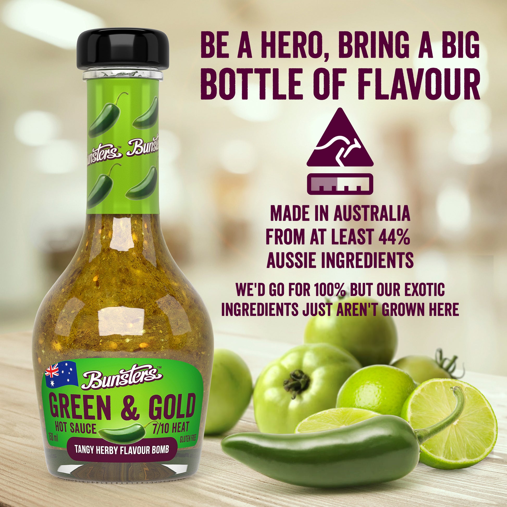 If you like Salsa Verde you’ll love Bunsters Green and Gold Hot Sauce. Be the hero of Taco Tuesdays forevermore with this moreish, tangy master stroke of flavour. Packed with green Jalapenos and Gold Charapitas, green tomatoes (tomatillos) coriander and tangy lime juice, this is an authentic mouth watering Mexican green sauce done Aussie style.